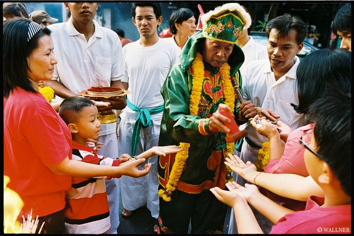 people's palms as a sign of good luck and prosperity. People were lining up all throughout Sathorn to receive one.